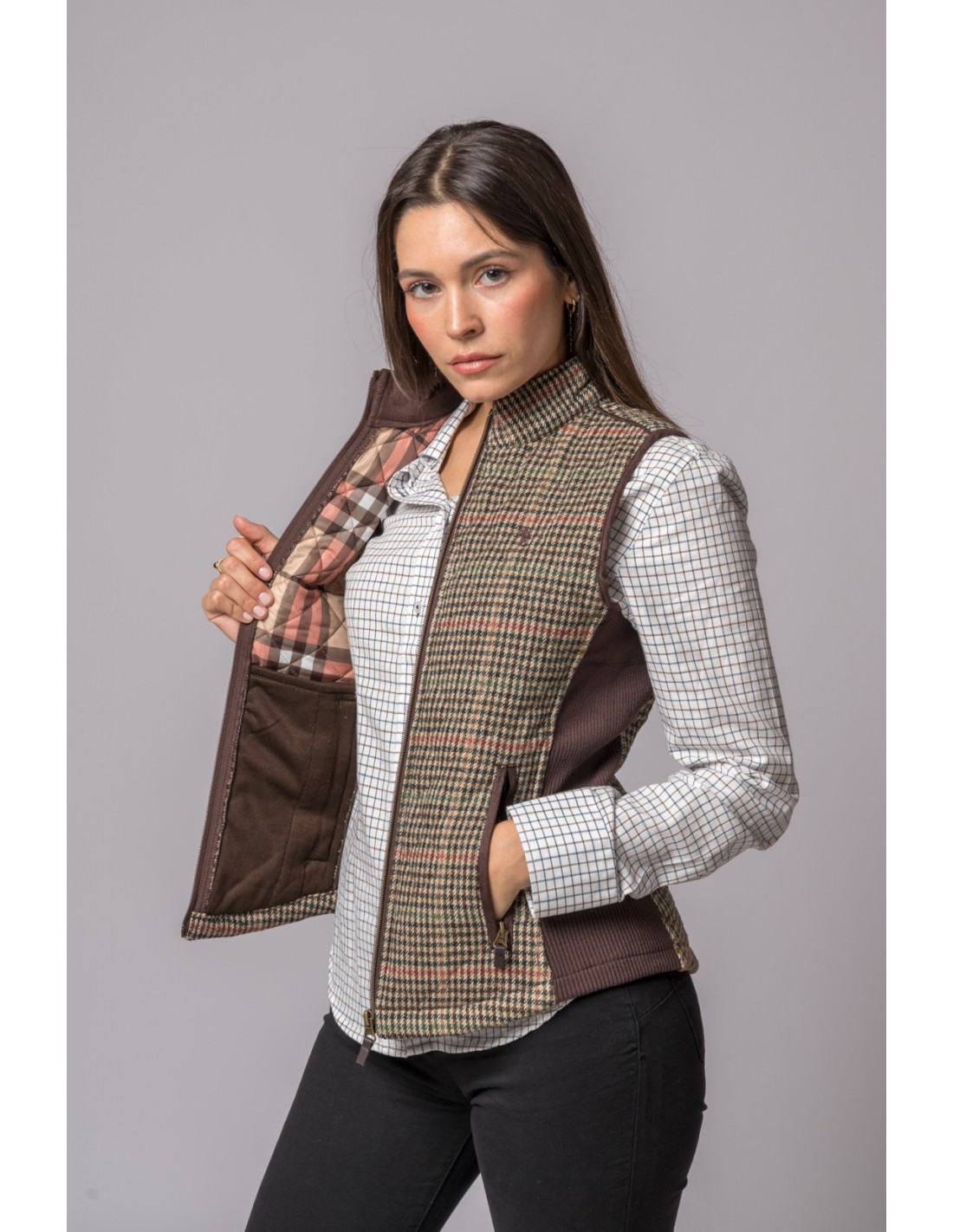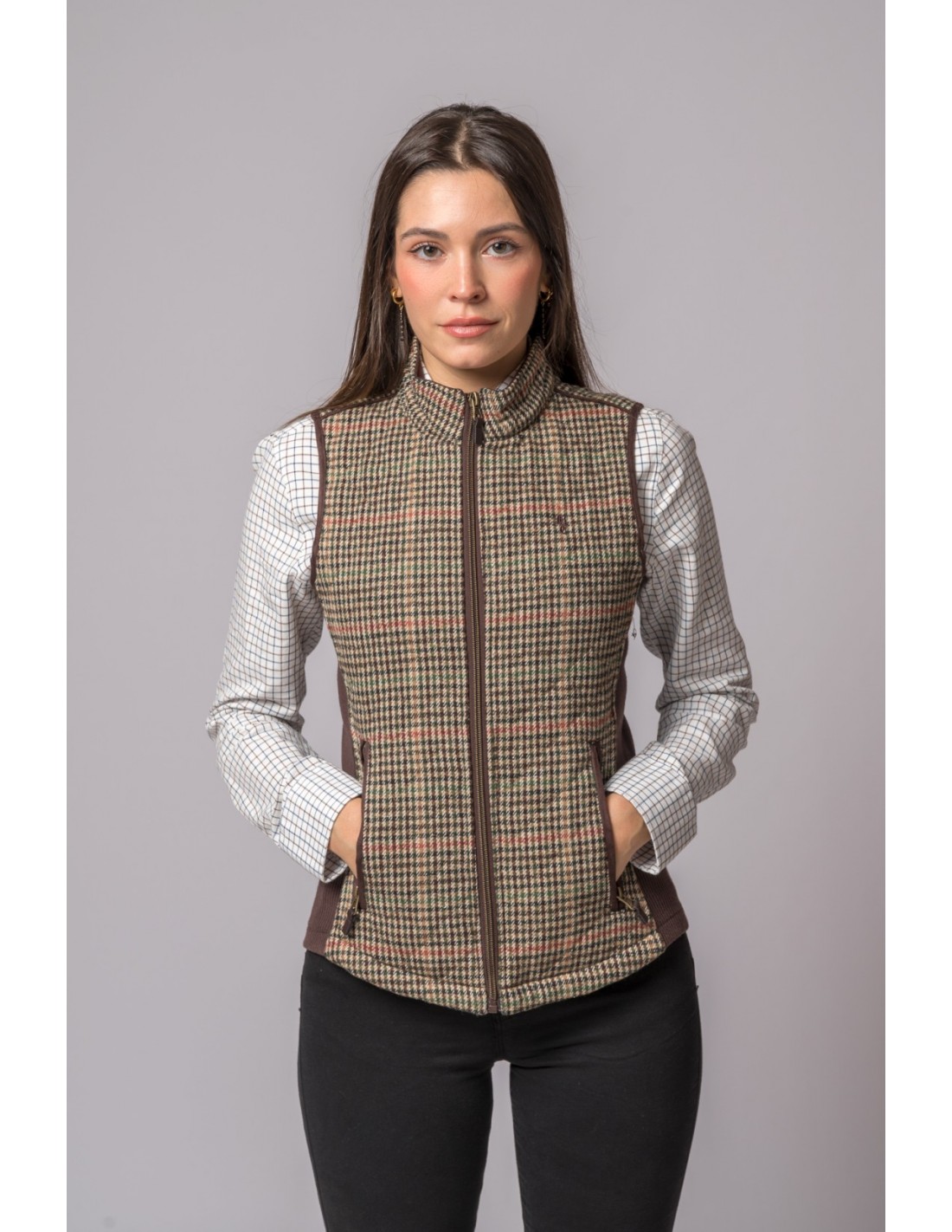 Chaleco Acolchado de Mujer Pata de Gallo. Cierre central con cremallera. Consta de 2 bolsillos inferiores con cierre con cremallera.