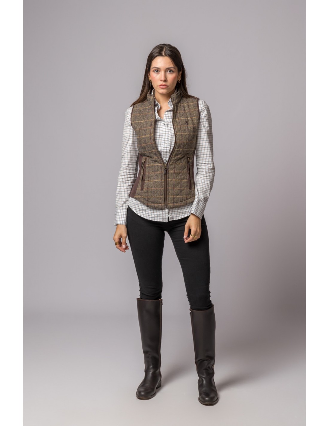 Chaleco Acolchado de Mujer Espiga Tweed. Cierre central con cremallera. Consta de 2 bolsillos inferiores con cierre con cremallera.