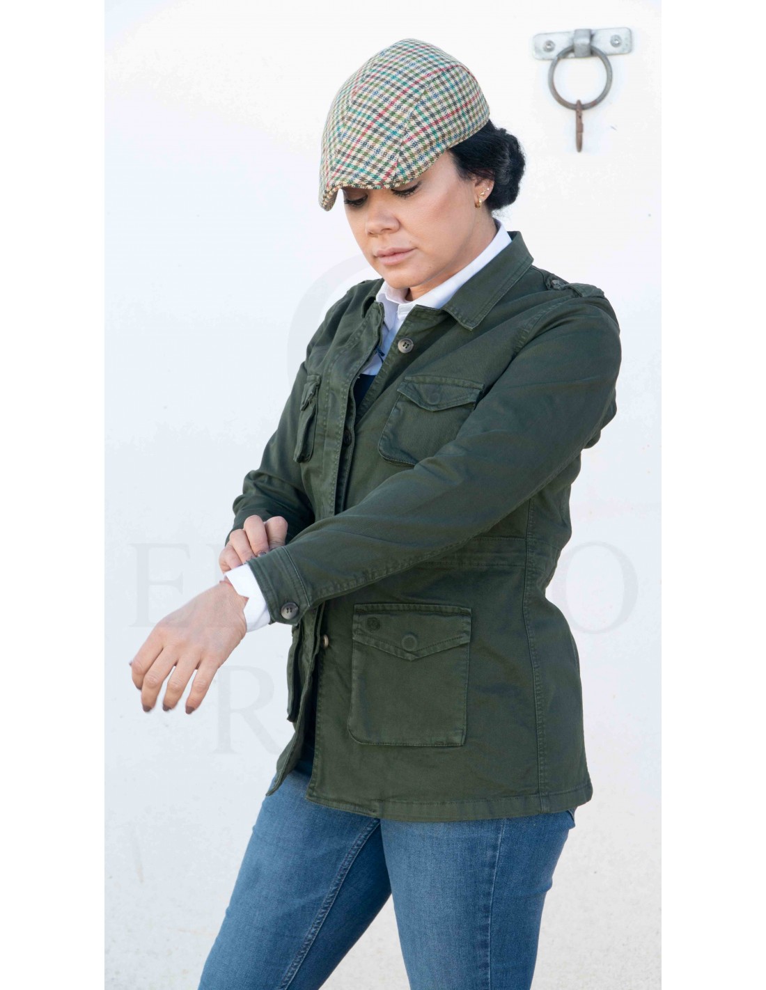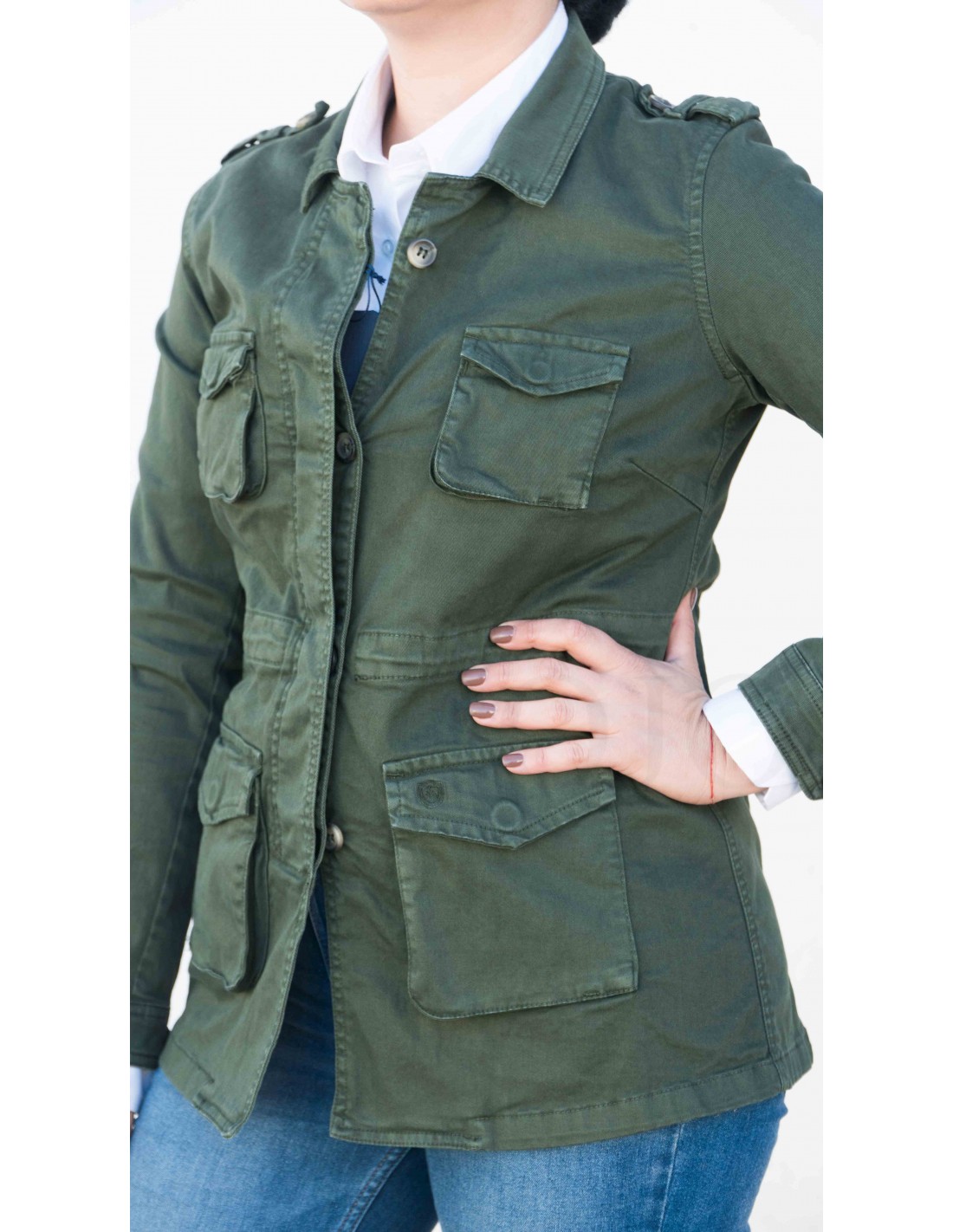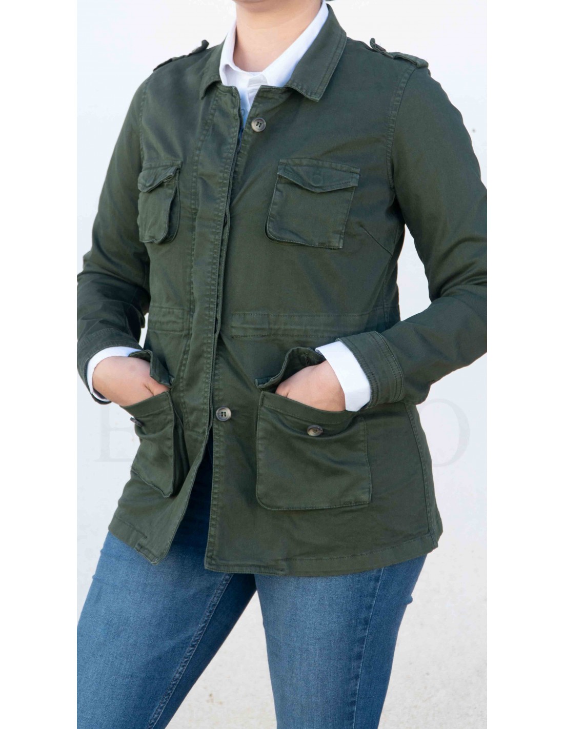 A la VaqueraSahariana en color verde caqui, confeccionada en 98% algodón y 2% licra, con cierre frontal con cremallera oculta por una solapa con ojales y cierre de botones.