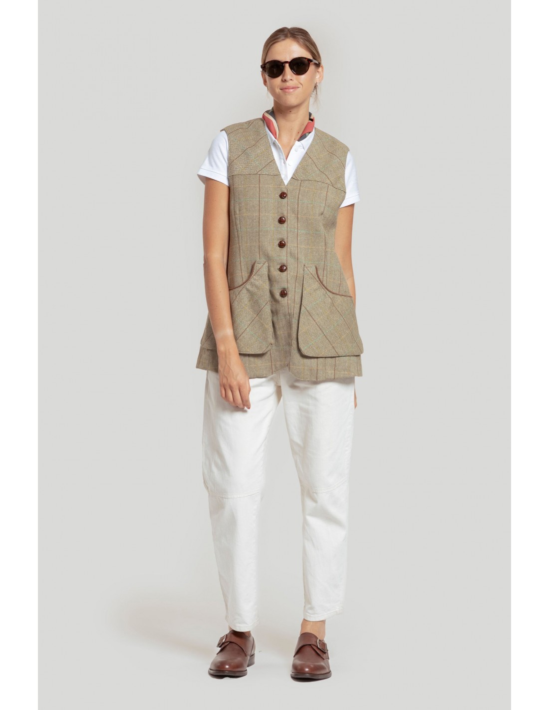 Chaleco femenino en tono kaki, diseñado con una funcional apertura frontal mediante botones y un favorecedor cuello en V que estiliza el torso. Su corte estructurado y color versátil lo convierten en una pieza fundamental para transiciones de temporada, aportando un toque de sofisticación militar-chic a cualquier conjunto.